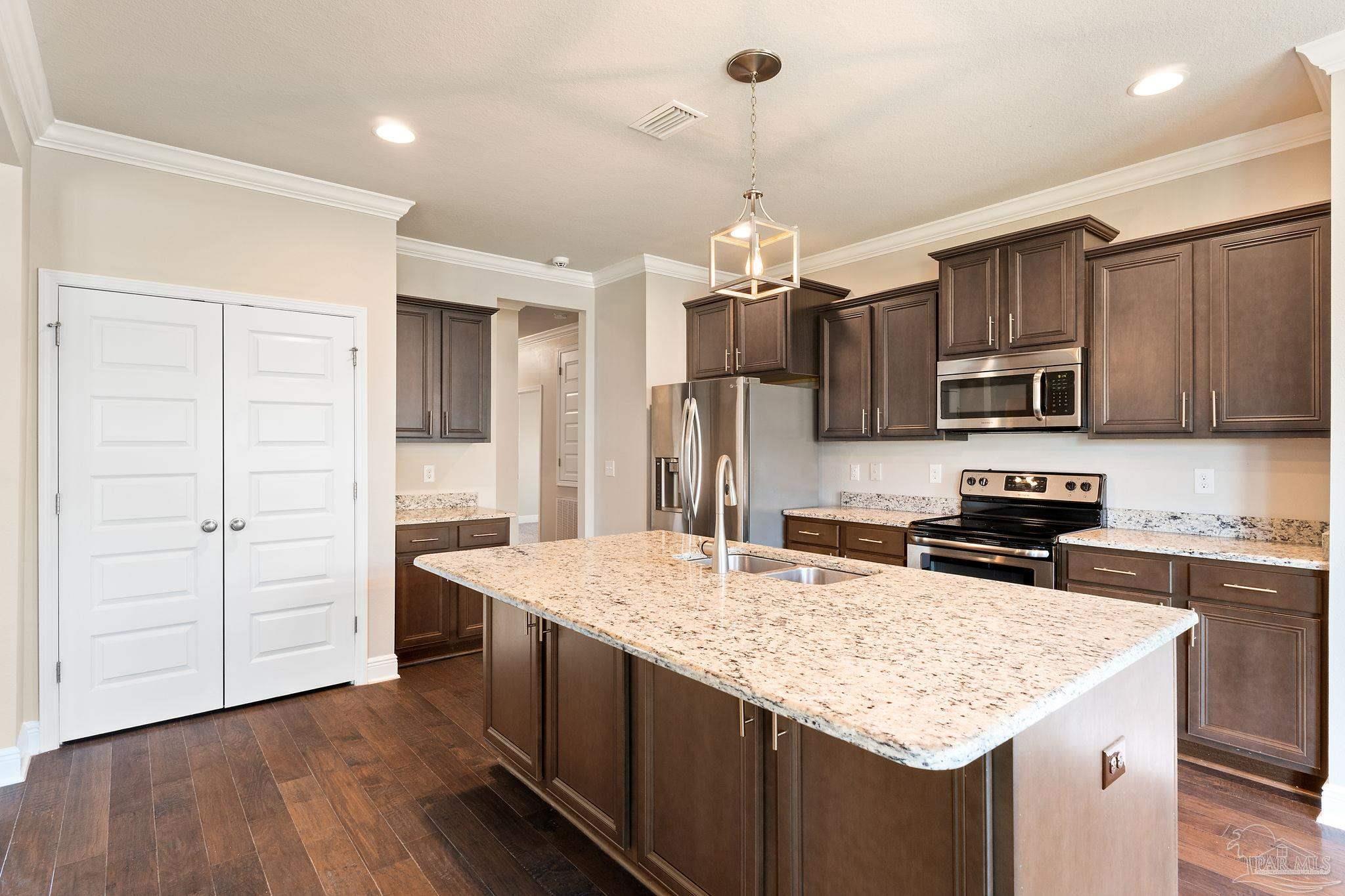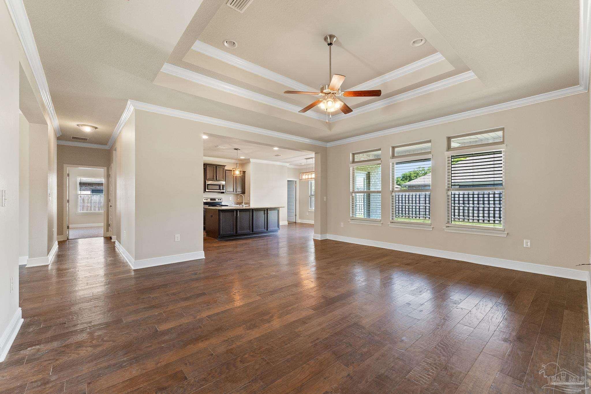 Your peaceful retreat in the heart of Pace includes this impeccable, FRESHLY PAINTED home with FOUR BEDROOM split-bedroom plan plus OFFICE, THREE AND A HALF BATHS, including a powder room for guests and a privacy-fenced backyard all while tucked away in the small enclave known as Heritage Estates --just minutes from shopping such as Target, home improvement, restaurants, a movie theatre, Pace schools, and the 4-mile walking trail that connects to Benny Russell Park! Your friends will love relaxing on the covered back porch while you grill or unwind under the stars. Inside, 5" hardwood floors flow through the main living areas, complementing the open layout, soaring ceilings, and large picture windows illuminating the home with soul-refreshing sunlight. Off the foyer, you'll find a formal dining room and a versatile office with French doors for privacy. The bright and cheerful Great Room features a double-tier ceiling, power room, an large pictures windows overlooking the private backyard, and, just around the corner a double French door leading to the covered back porch and backyard. The chef's kitchen is a dream with miles of countertops, a coffee bar/bakers area, an oversized island with a sink and extra cabinet space on both sides, stainless appliances, a double pantry, and tons of cabinet space. The split primary suite is a true retreat--double-trey ceiling, and an en-suite bath with a huge walk-in closet, double vanities, garden tub, separate tile shower, and a private water closet. On the opposite side of the home are three additional bedrooms, two of which share a Jack-N-Jill (Continental) bath, and an extra full bath for guests. Extras include stunning hardwood floors, upgraded crown molding, inside laundry, finished 2-car garage with epoxy flooring, gutters, sprinkler system on reclaimed water, peaceful evenings, weekend BBQs, and morning strolls on the nearby trail. See where your next chapter begins!